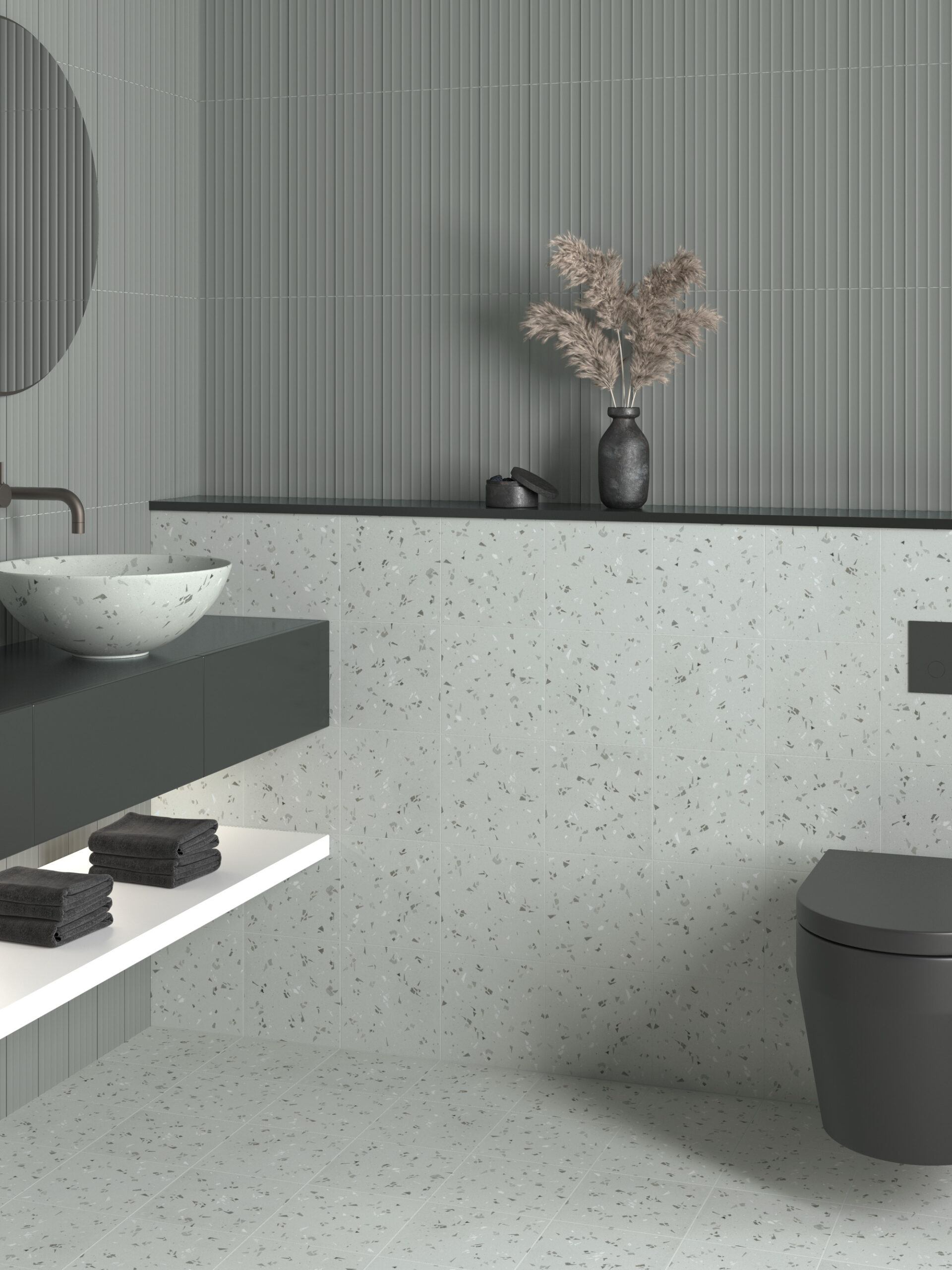 Azulejo porcelánico en formato 20x20cm, inspirado en el terrazo tradicional, reinterpretado con pinceladas contemporáneas pintadas a mano. Sobre una base blanca, los fragmentos destacan por sus diferentes tonalidades de gris, aplicados de una manera expresiva y dinámica que otorga profundidad cromática. El esmalte soft&safe es suave al tacto y garantiza su seguridad incluso en zonas húmedas.