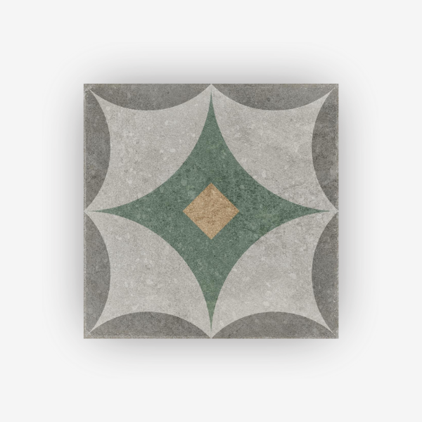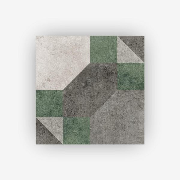 Grazie es un azulejo porcelánico, en formato 20x20cm, que destaca por su diseño geométrico inspirado en la arquitectura moderna de Milán, combinando tradición y vanguardia en una pieza sofisticada. Su patrón tridimensional juega con tonos neutros y elegantes, donde el gris piedra se fusiona con un verde profundo y matices tierra, evocando la riqueza cromática de los mármoles y estructuras de la ciudad. Con un acabado que hace un guiño al terrazo, incorpora sutiles toques de brillo con pequeñas incrustaciones de cuarzo, aportando dinamismo y profundidad visual. Su composición permite crear juegos de perspectiva únicos, convirtiéndolo en una opción ideal para espacios contemporáneos con un carácter artístico y atemporal.
