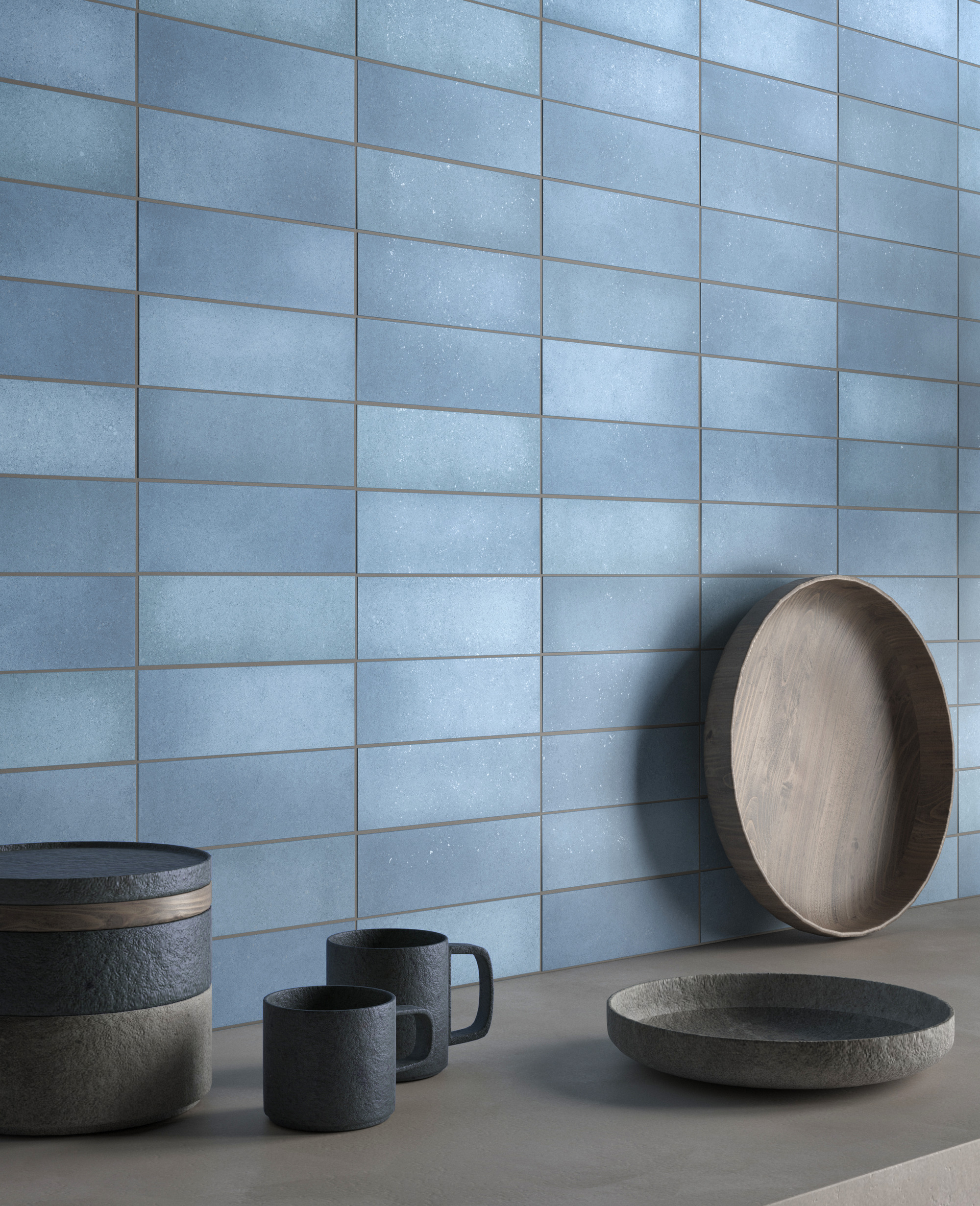 Azulejo de revestimiento en formato 6,5×20cm y pasta blanca, con acabado mate y textura mineral, que recuerda a las superficies de piedra volcánica. Su tonalidad, limpia y luminosa, realza los destellos sutiles de cuarzo y potencia la luz en cualquier ambiente. Ideal para ampliar visualmente espacios y aportar serenidad.
