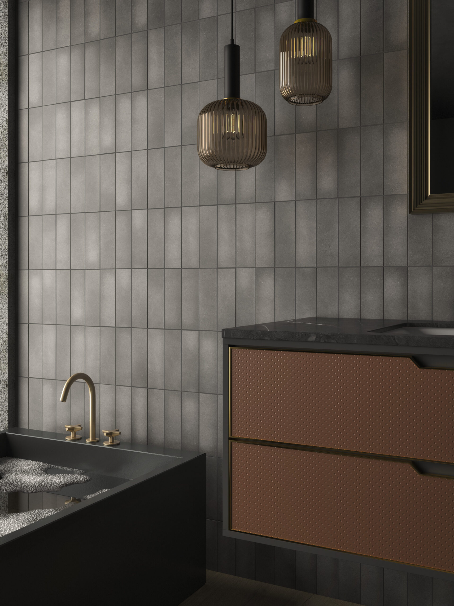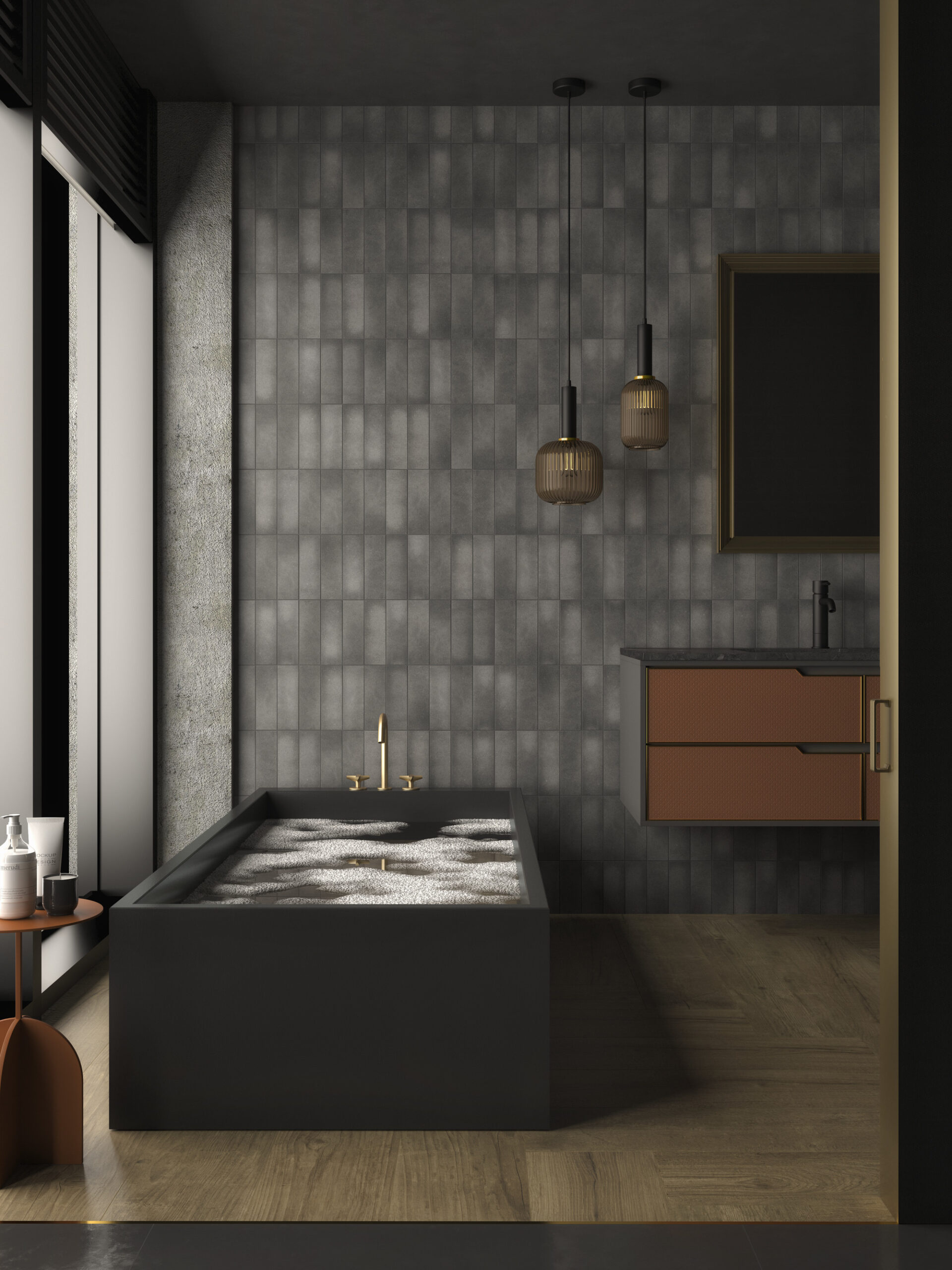 Renania es una colección cerámica inspirada en los paisajes minerales de la región alemana homónima, reconocida por el uso de piedra de lava en arquitectura y diseño. Su revestimiento en formato 6,5x20 cm presenta una textura lisa, borde recto y acabado mate con microincrustaciones brillantes que simulan cuarzo. Una estética que combina la sobriedad de la piedra con matices cerámicos únicos.