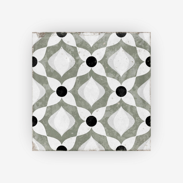Azulejo porcelánico en formato 20x20cm que reinterpreta la belleza de los antiguos azulejos hidráulicos con un diseño inspirado en la tradición cerámica de los pueblos de la costa atlántica francesa. Su tonalidad verde terrosa, cálida y natural, se enriquece con detalles matéricos que aportan textura y profundidad. La incorporación de pasta de vidrio transparente resalta el dibujo con un sutil brillo y mayor volumen, realzando su carácter artesanal. Elaborado con técnicas avanzadas y materias primas seleccionadas, este azulejo es ideal para quienes buscan autenticidad y sofisticación en sus espacios.